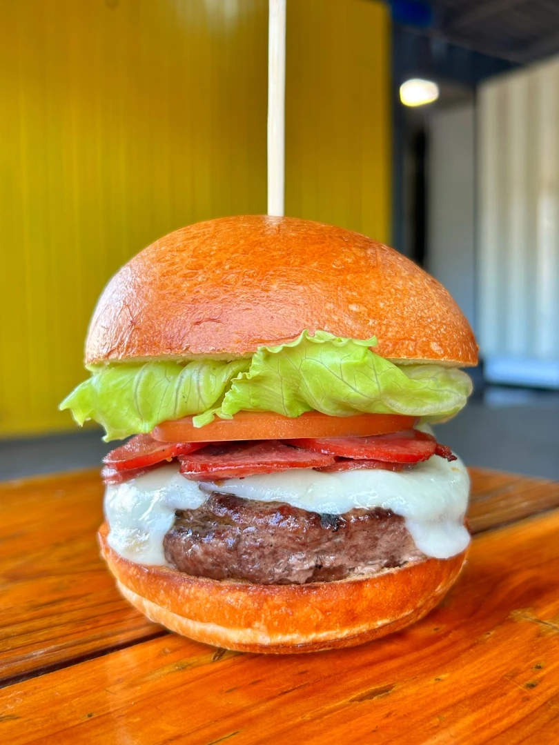 Pão de brioche super macio, burger 160g, queijo mussarela, bacon picadinho e salada de alface americana com tomate