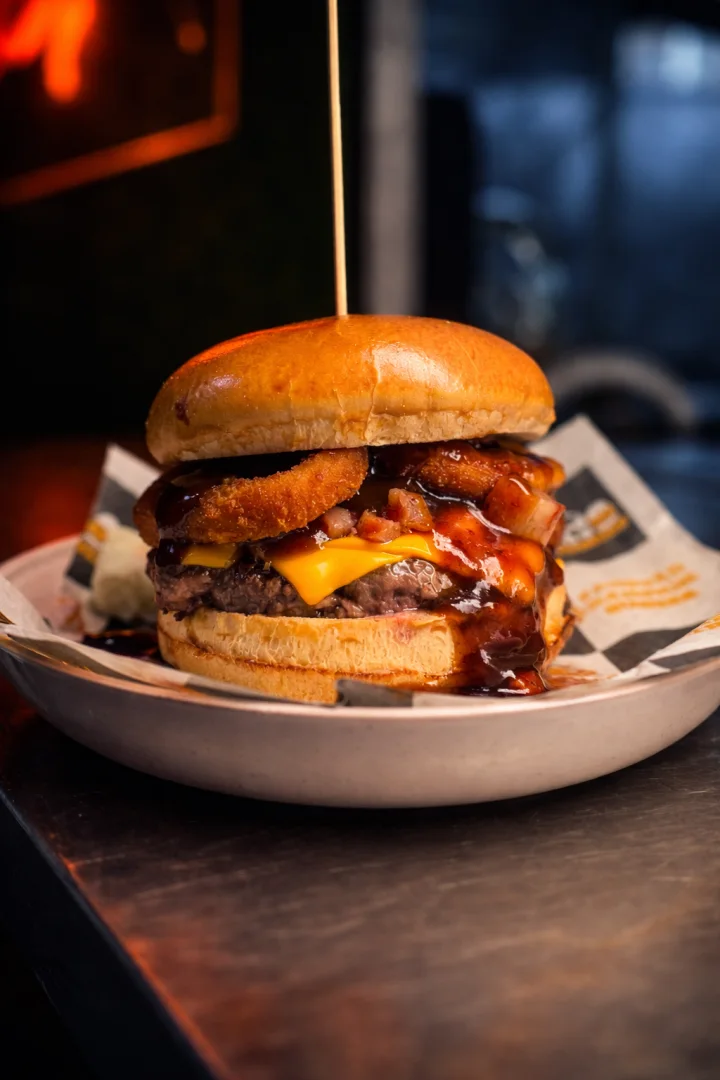 Pão macio, burger 160g angus, cheddar, onion rings, bacon picadinho, finalizado com barbecue.